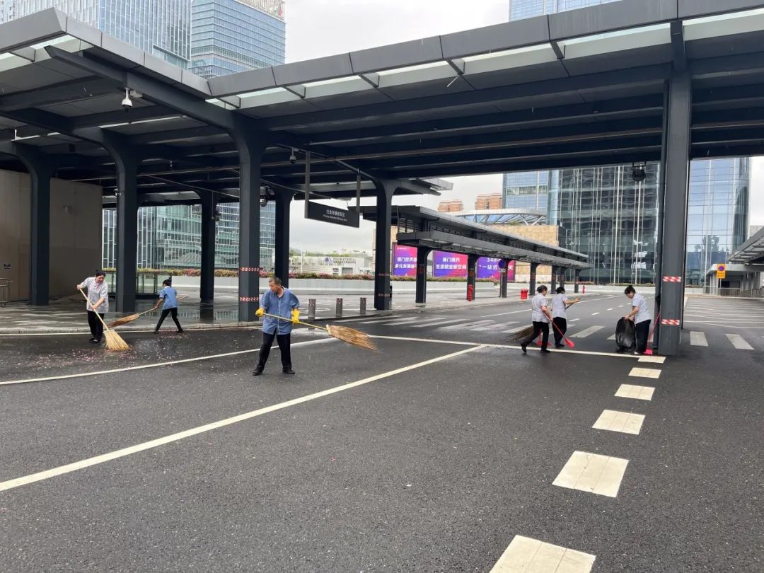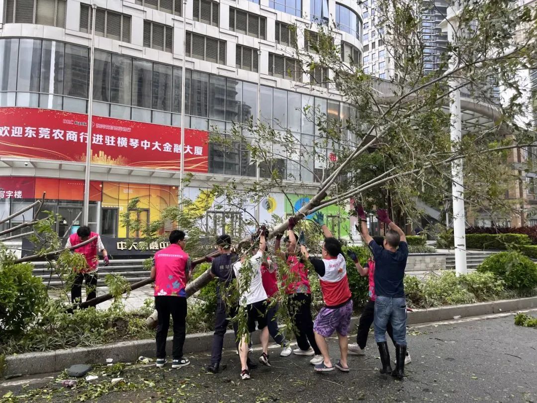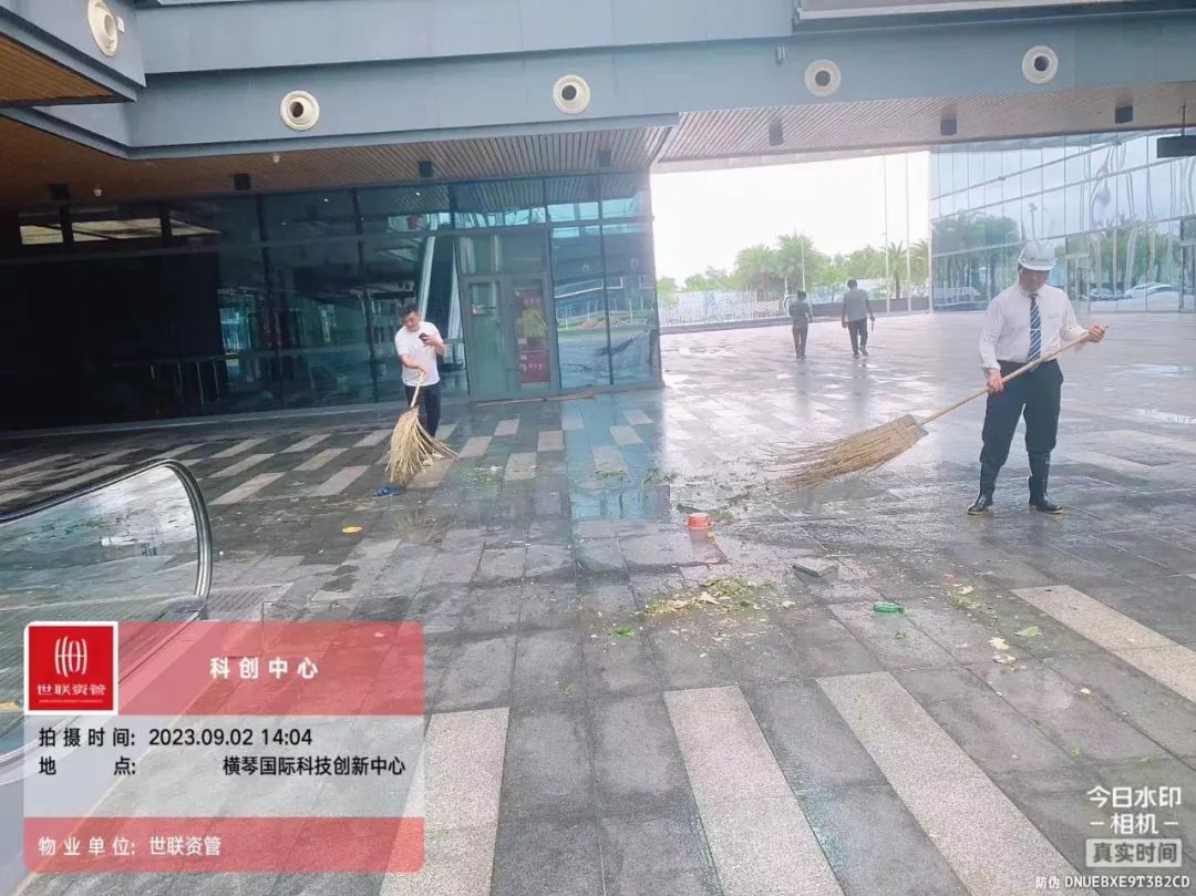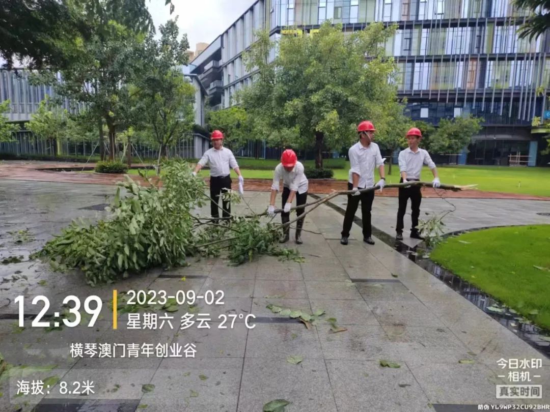 第一时间对园区环境进行清障复原,完成园区所有枯树树叶清理、树木扶正,树撑检查加固;完成园区公共垃圾桶、烟灰柱、地毯复原工作;检查受灾情况并进行修复,检查设备机房、电梯是否正常运行等,确保企业可正常办公。其中横琴国际科创中心园区应急避难场所本次接待人员约1500人次,产生生活垃圾约3吨,人员撤离后已及时清理。