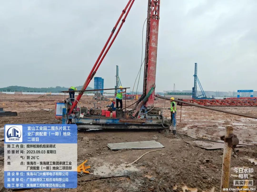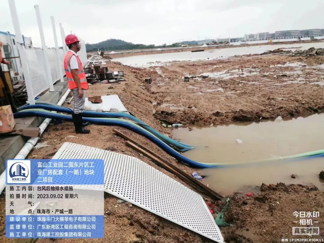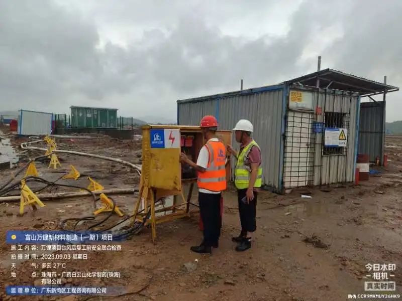在斗门球盟会体育5.0产业新空间万锂新材料(一期)项目现场,开展了台风后复工复产安全大检查,现场组织排水、围挡修复各项工作。