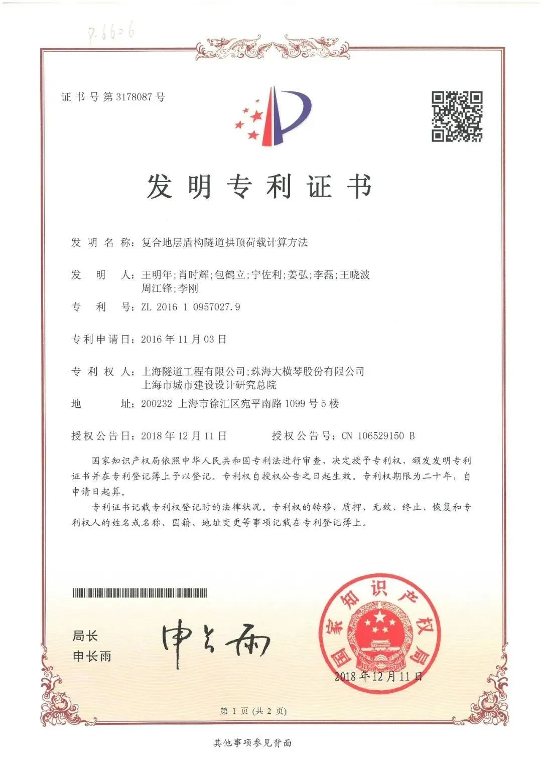 横琴隧道在经过评审委员会评审,指导委员会审定以及网站公示等程序,以优异的科技成果和工程质量脱颖而出。本次殊荣的获得是建筑行业系统对该项目多年来取得的科技成果以及工程质量的重要肯定。目前已形成科技成果29项,其中发明专利8项,国家实用新型专利18项,科技论文17篇,软件著作2项。