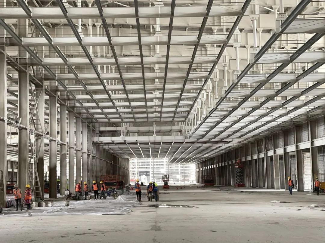 自从项目启动后,所有参建人员抢时间、赶进度,15天完成4万余平方米的场地软基处理,22天达成4万余平方米的底板及承台施工,30天搞好2400余根工程桩的施工与检测,45天结束7400余吨的钢结构主体安装施工,并克服两次台风、三次暴雨的恶劣天气影响,仅用时97天,建成了11.7万平方米厂房,再次刷新“球盟会体育速度”!